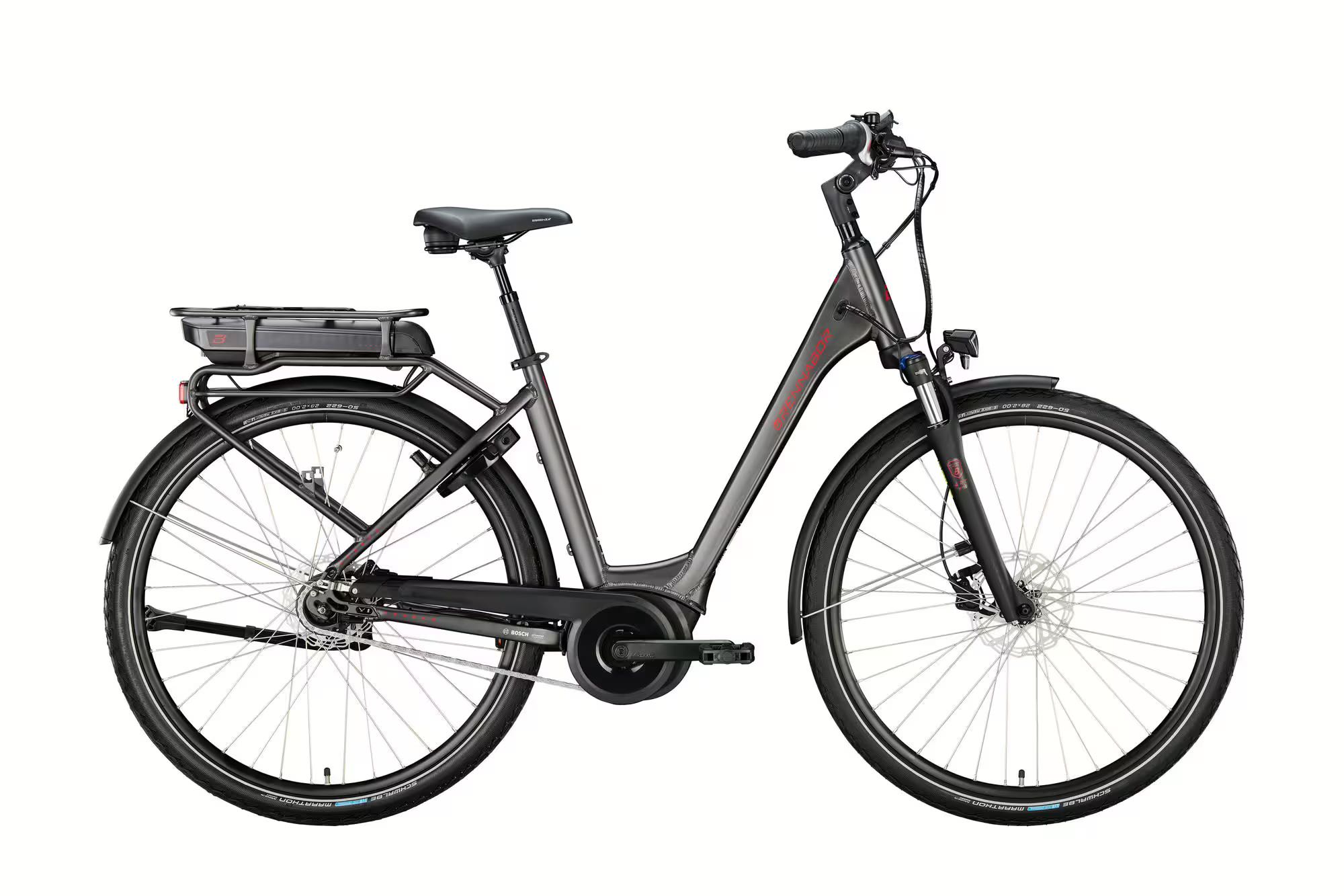 28”, el, unisex, Bosch centermotor, hydraulisk skivebremse, 7 indvendige gear, affjedring i forgaffel og sadel, farve grå/rød, Kr. 17.999,-